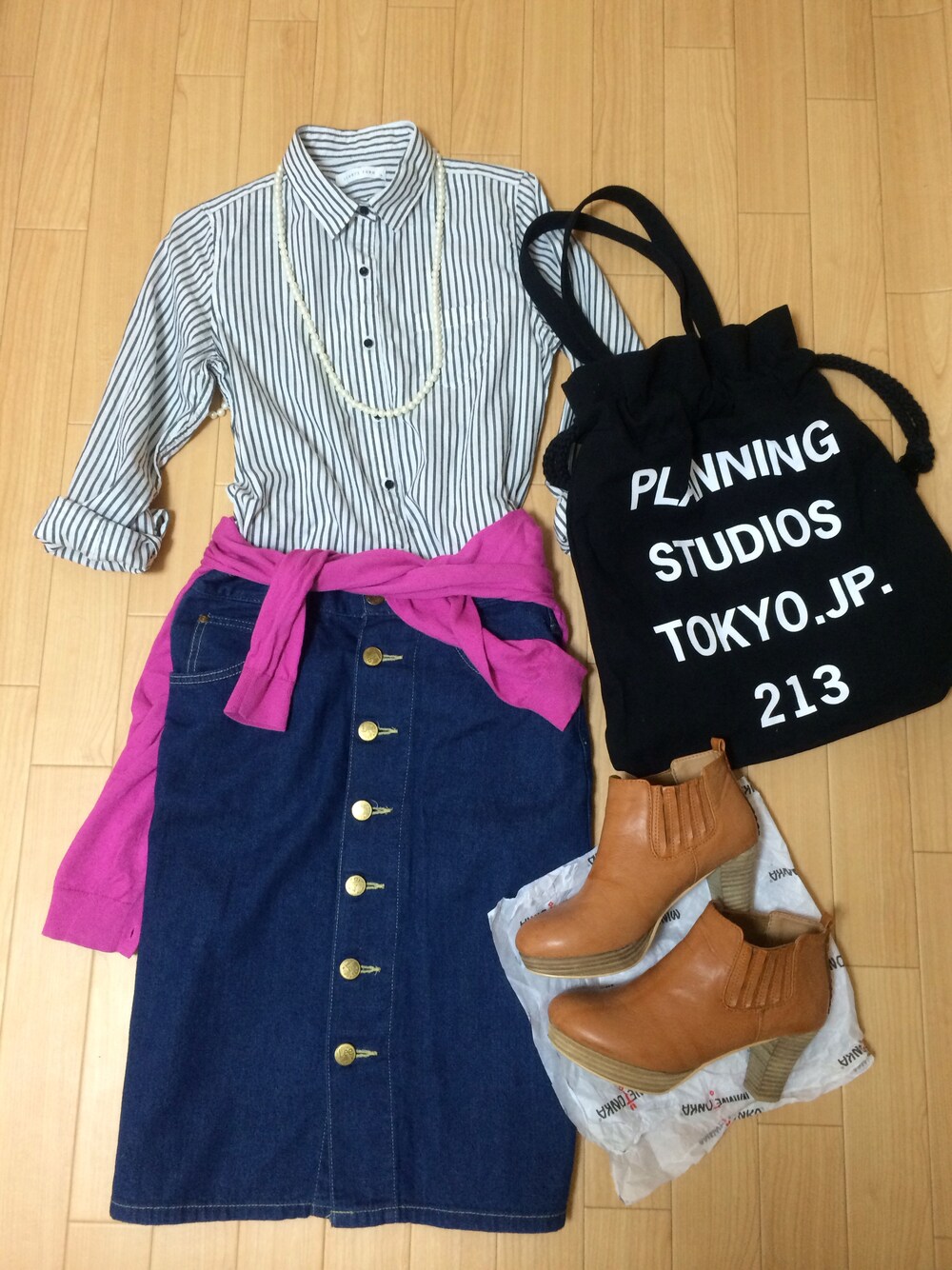 ストライプシャツ/LOWRYS FARM カーディガン/UNIQLO デニムスカート/Lee×LOWRYS FARM 靴/Dip Drops パールネックレス/不明 トートバッグ/Ray Cassin UNIQLOのカーディガンはUVカットしてくれるから有り難い! トートバッグはリュック仕様になっていたけど、ヒモをほどいて切ってちょっと改造。トートバッグとしてのみ使えるようにしました。 ヒモをきゅっとして、巾着の形が可愛い。