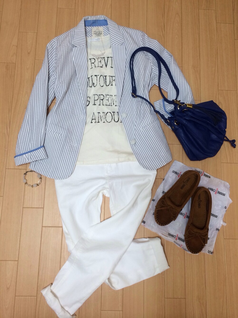 ジャケット/ikka Tシャツ/INDEX パンツ/ARROW 靴/Minnetonka バッグ/Cours de Couleur ネックレス,ブレスレット/不明 さわやかな感じで。