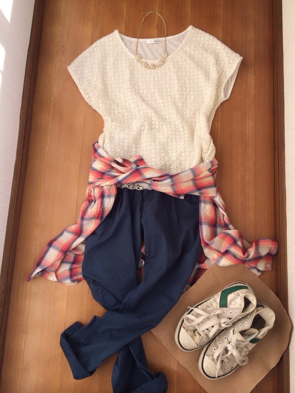 トップス/three Quarter チェックシャツ/LEPSIM LOWRYS FARM パンツ/coen スニーカー/PONY リュックを合わせたいけど死ぬほど似合わない…Σ(゚д゚lll) 帽子ほしいな。紫外線対策は念入りに。