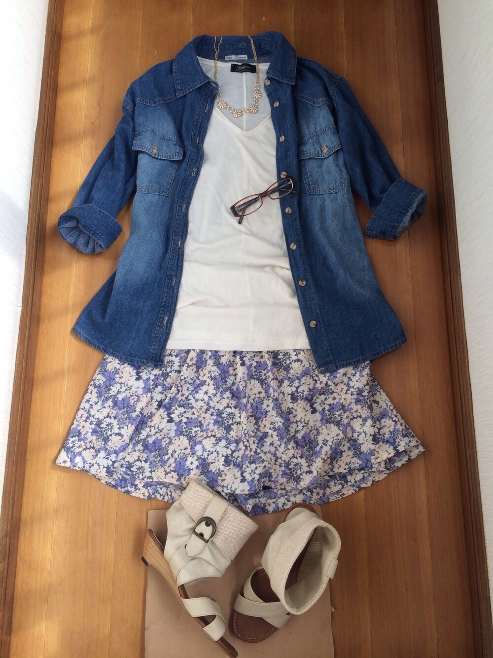 この靴、合わせるのなかなか難しい… マジェのショーパンは、一見スカートに見えるけど、ショートパンツです( ´ ▽ ` )ノ オーバーサイズのデニムシャツと、滅多に履かないショートパンツでバランスに気を付けてみました。 Tシャツ/AZUL by moussy ショートパンツ/マジェ サンダル/JELLY BEANS めがね/KENZO
