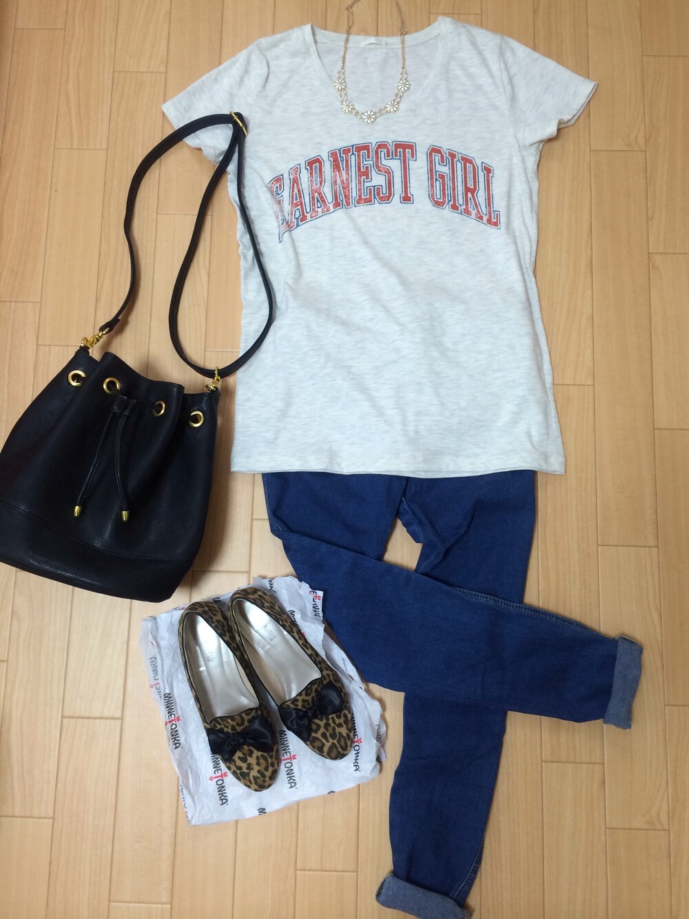 Tシャツ/GU スキニーデニム/LEPSIM LOWRYS FARM バッグ/LIMITLESS LUXURY 靴/伊勢丹で購入 ラフな格好の時は、きちんと感がでるような小物を合わせます。