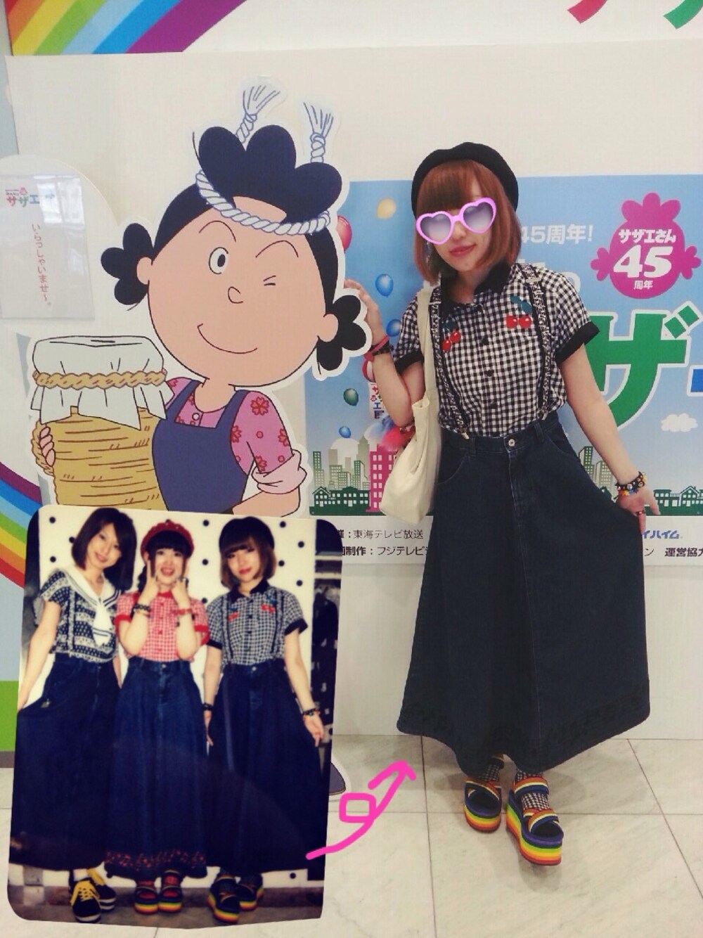 つくしちゃんが名古屋に来て二日目ー! 夜中に合流してお泊りして、三人でデニムスカート合わせやりました(^O^) わたしall candy stripper☆ チェリーのシャツはセールで半額 デニムスカートは70%OFF 普段買わないアイテムだからセールで挑戦してみた! 靴下は前に買ってたんだけど偶然シャツとお揃いw レインボーサンダルも初めておろしたのだ。 かほちゃんにはベレー帽と靴下も全部合わせさせ← 完全ツインが完成!! 二人もwear更新すると思うからお楽しみに(^O^)← しかしスカートの暑さ半端なかった〜笑