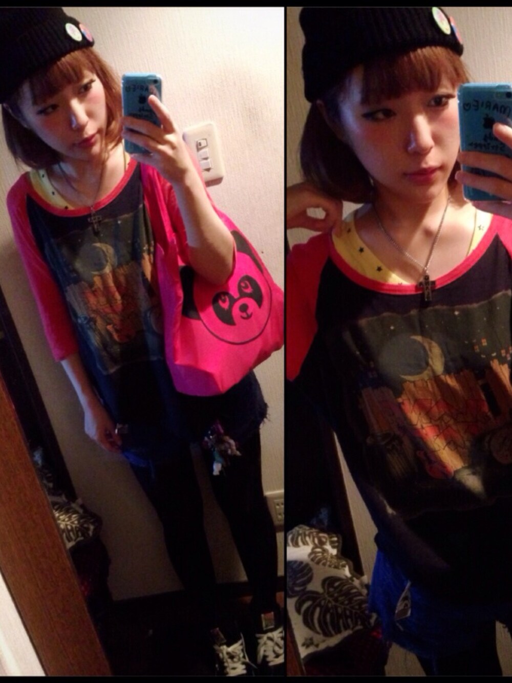 いつもと違うアプリで加工すると写真が近くなってしまう(o_o) もうめんどくさいのでこのまま! 仕事行く時〜つまり移動着。 RNAのラグランにショーパン(青) wegoのニット帽にVANSのハイカット〜 カバンはcandy stripperのノベルティ笑 どれも全部ヘビロテ!