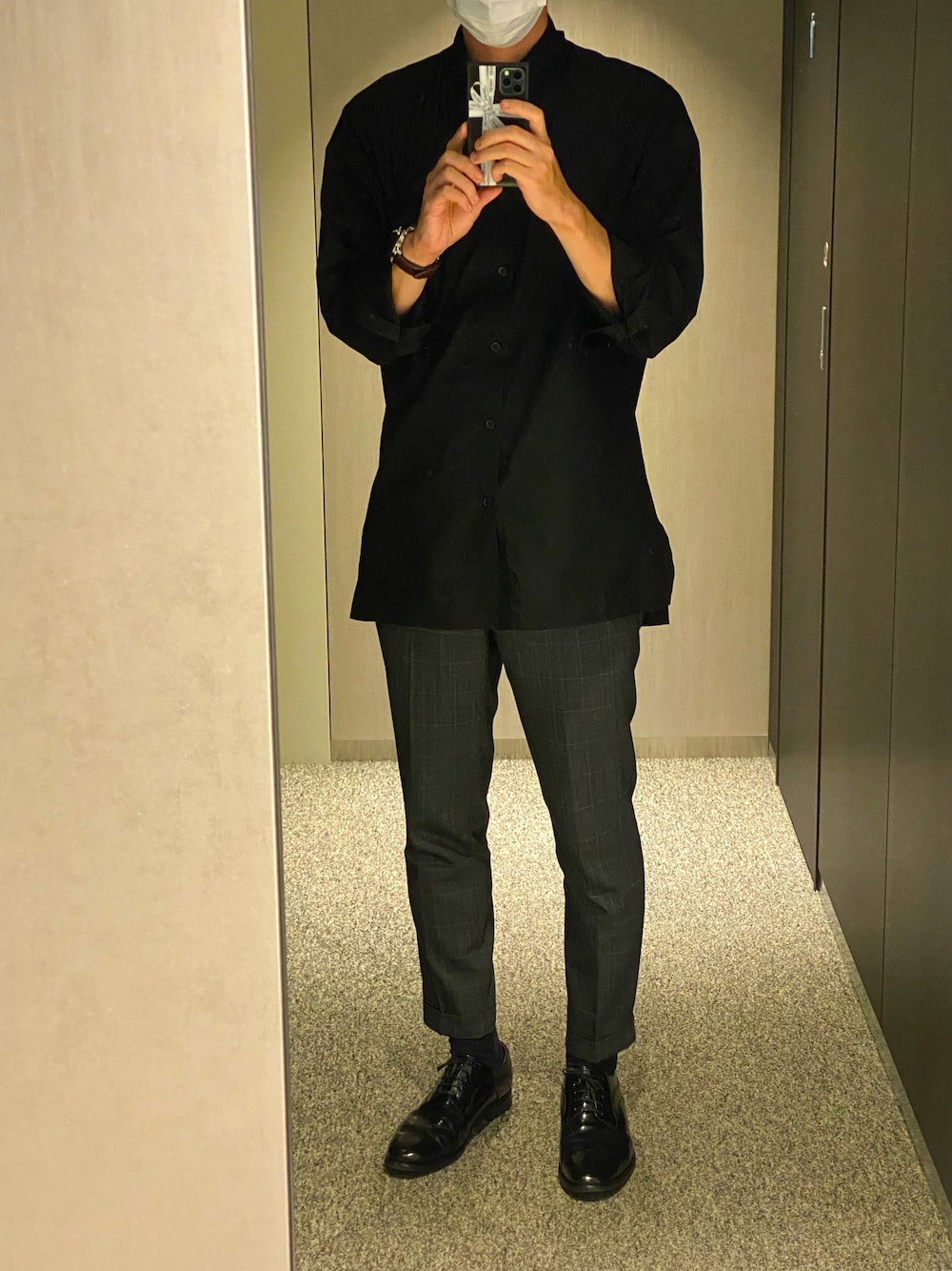 久々。仕事スタイル。長めの黒シャツにグレーのチェックスラックスでシンプルに。