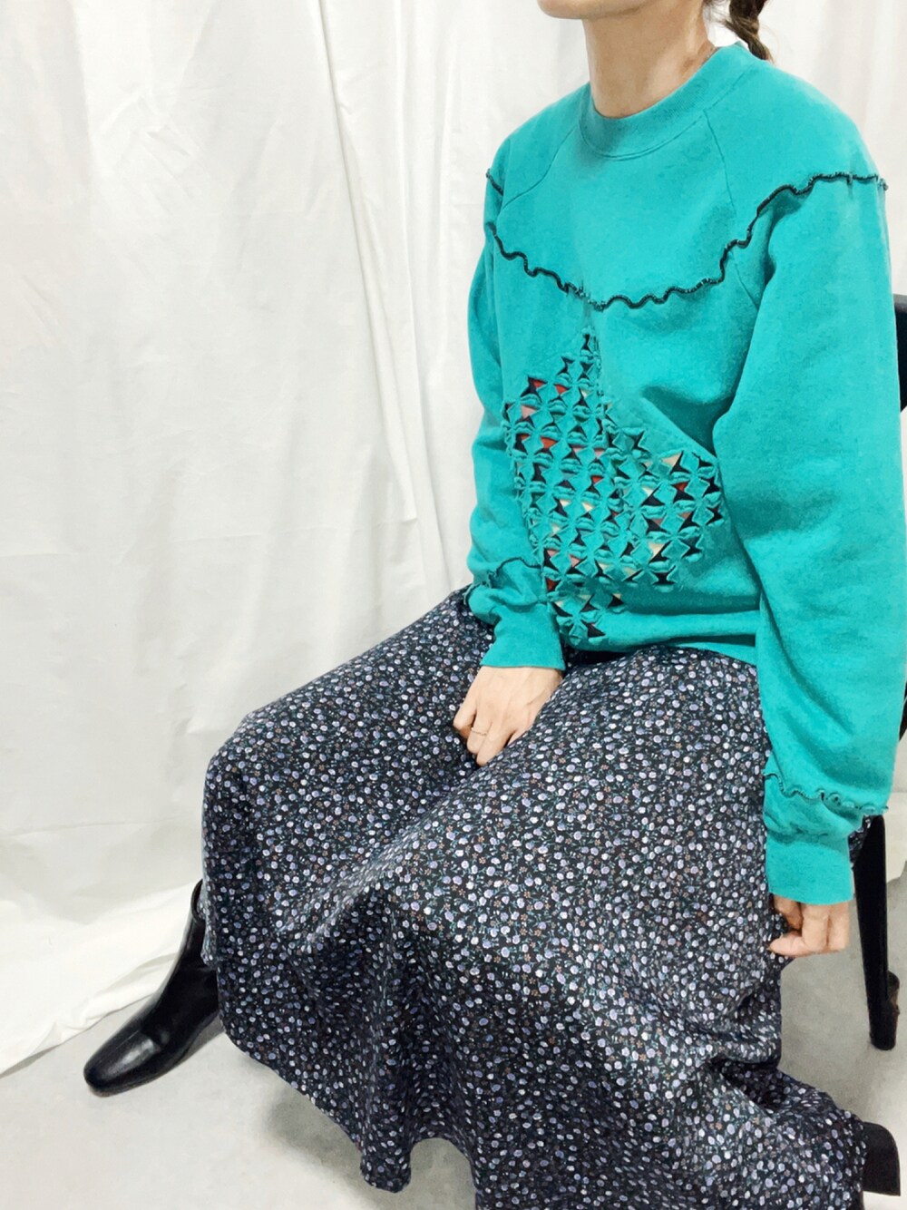 エメラルドなスウェット。 パイピングや、フロントのカットオフが良いですね♢♡♤♧
