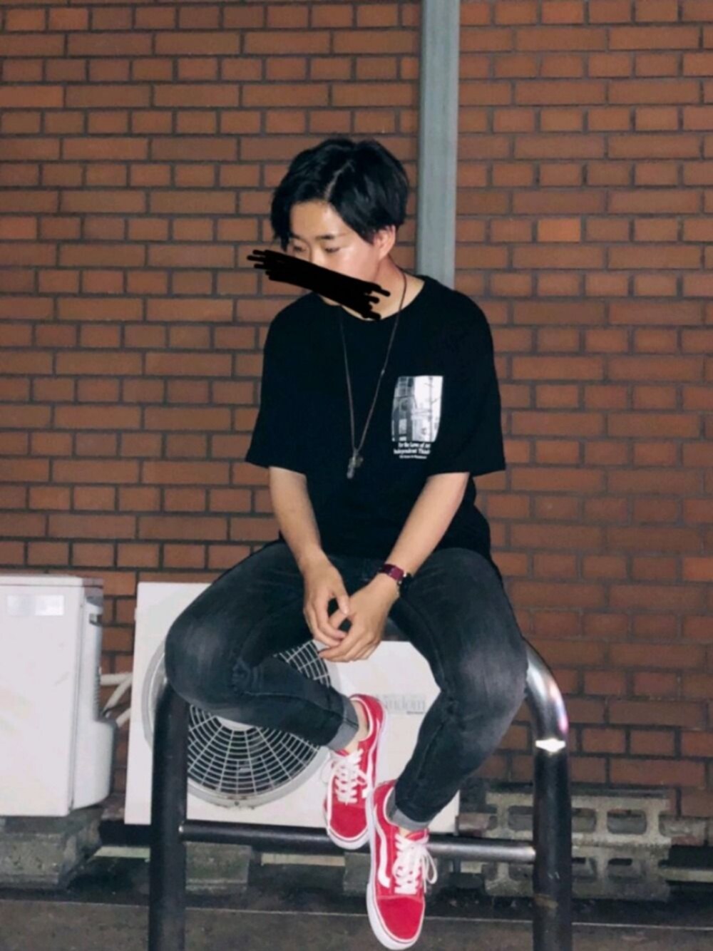今日は前髪を上げたのでカッコよく黒Tで! ! 差し色に赤のVANS🎶