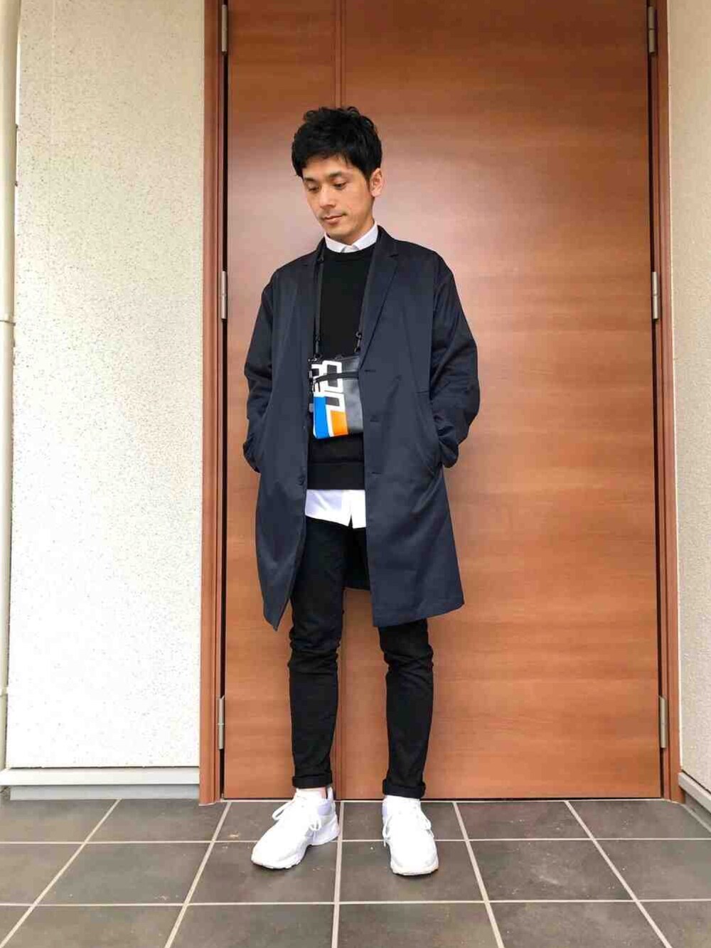 ネオンカラー(オレンジ)のあるミニバッグとスニーカーを使って、ネオンカラーを引き立てるために他は落ち着いた色にしました。