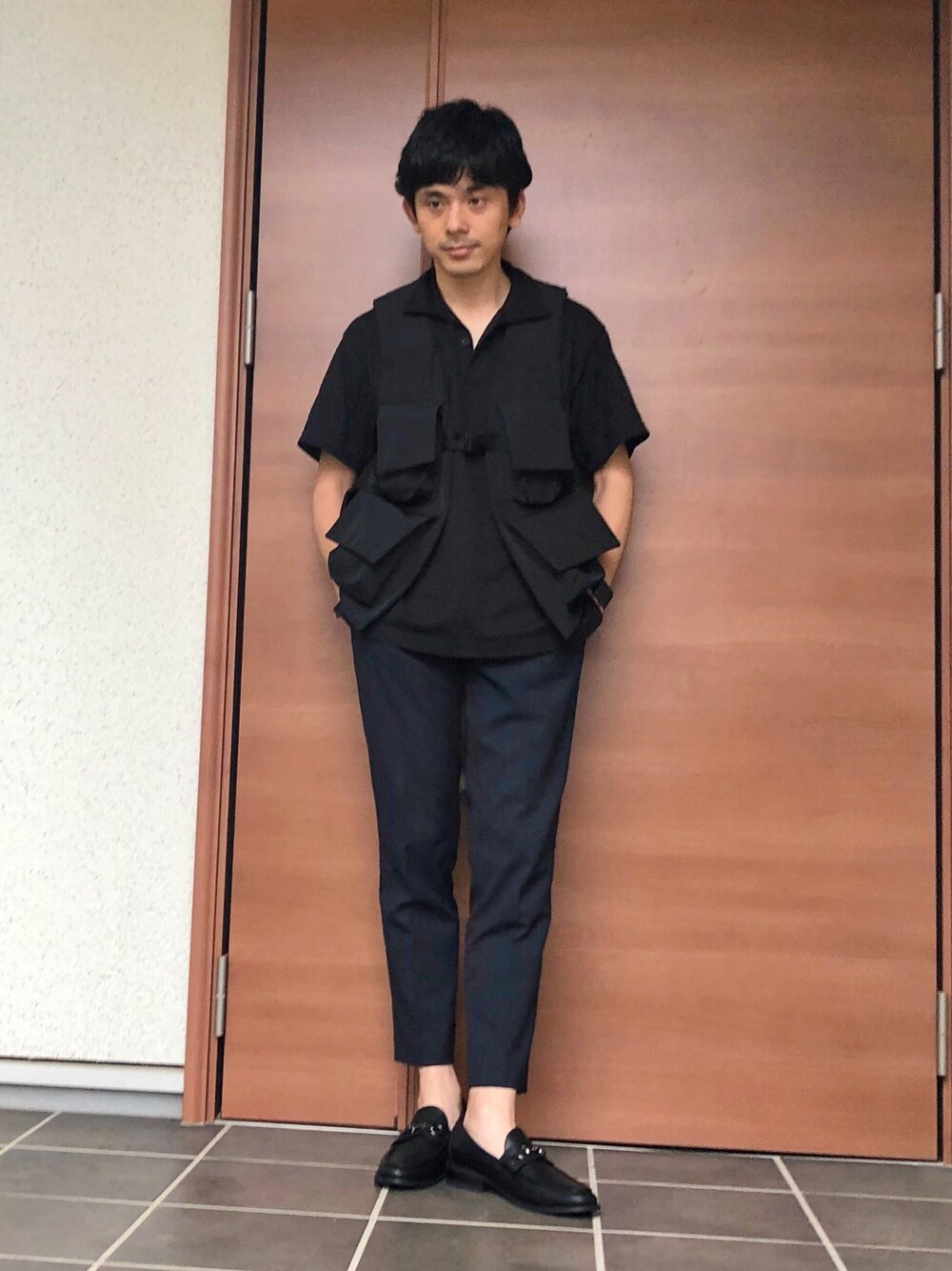 雨で涼しいから久しぶりにユーティリティーベスト。黒ポロシャツに合わせてベストが目立ちすぎないようにしました。 足元は合皮のローファーだから雨でも大丈夫。