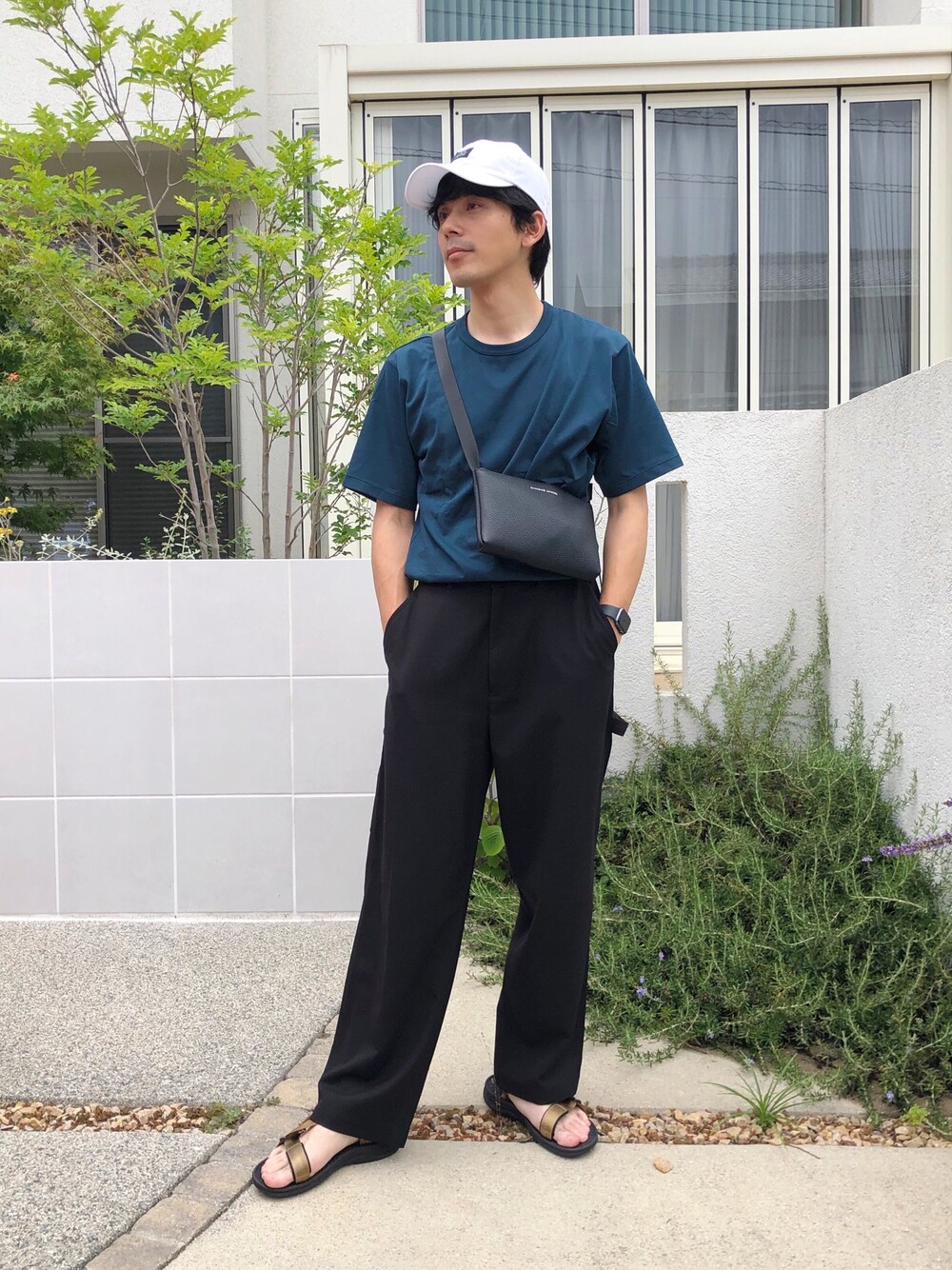 ツヤのあるユニクロUのスーピマコットンTシャツとワイドパンツでAラインを作り、サンダルとキャップで崩しました。