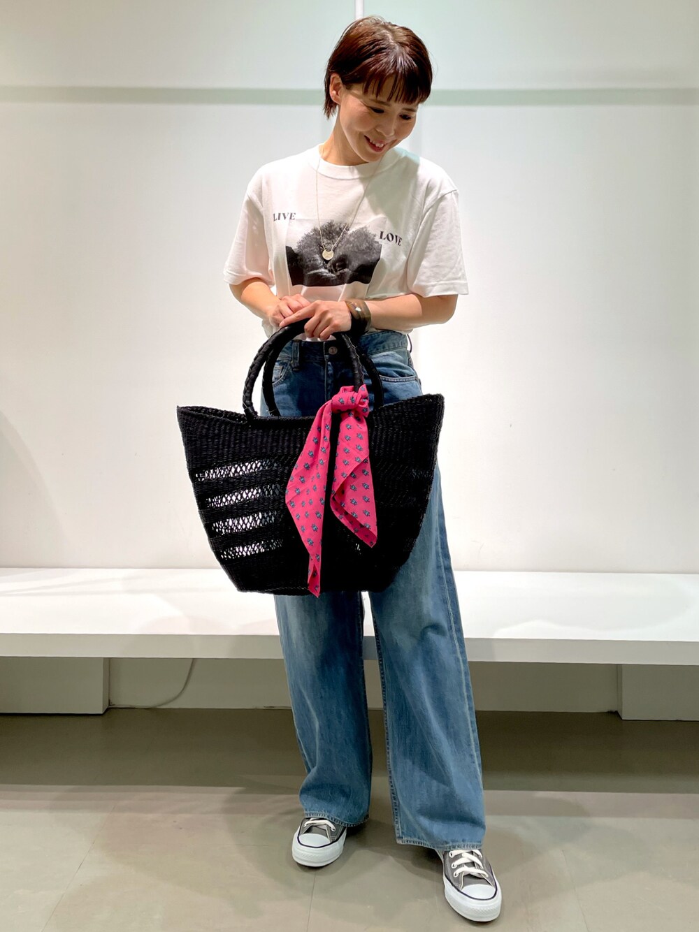 大きめのかごバッグをコーディネートのアクセントに♪