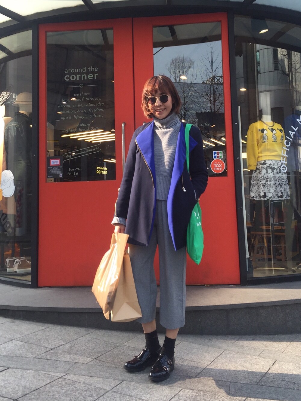 韓国2日目です。 今日はセーターとパンツをグレーで統一させて、ワントーンコーデっぽくしました。 コートの青とカバンで差し色も加えて、ちょっと遊び心を加えることであんまりシックになり過ぎず、とてもカジュアルになるので可愛いです✨✨
