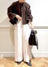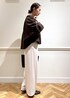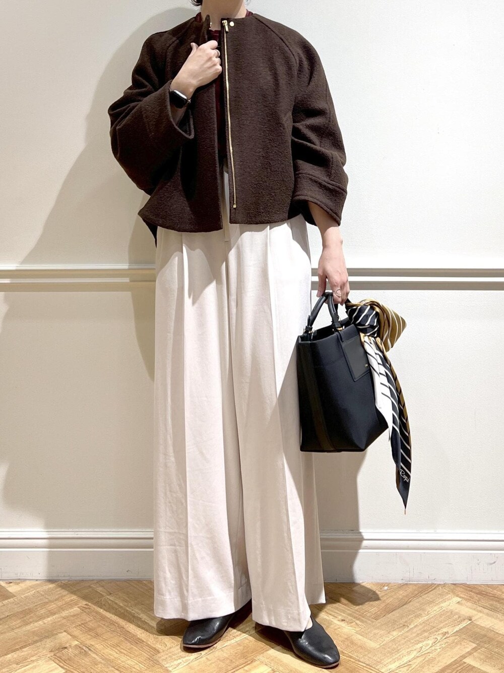 ショートコートで軽快にしつつフォルムの美しさが全体に動きを出してくれます。曲線的なデザインなので、合わせるボトムは直線(ストレートパンツやタイトスカート等)という選び方は簡単ですっきりしたスタイルになるのでおすすめです♪