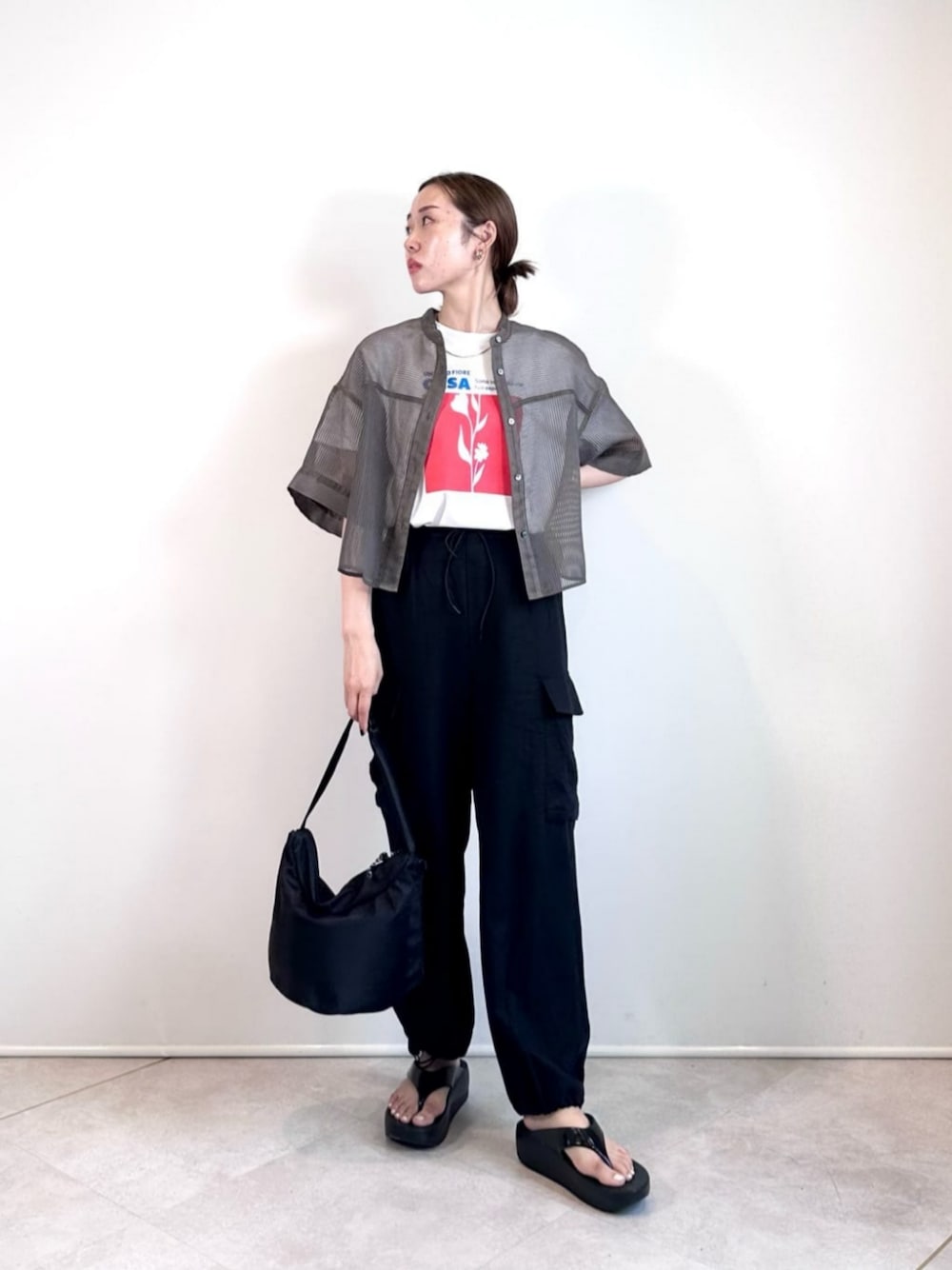 【サイズ感】 シャツ:丈やや短め インナー:標準的⠀ ボトムス:標準的〜ややゆったり シューズ: 標準的 【コーディネートポイント】⠀ 透け感のあるシャツにあえてロゴTシャツを透かせて大人カジュアルな印象に仕上げました。Tシャツだけだと物足りないときにこのシャツを取り入れるだけで一気にお洒落見えしてくれておすすめです♪シャツの丈がやや短めなのでボリュームのあるボトムスが相性◎