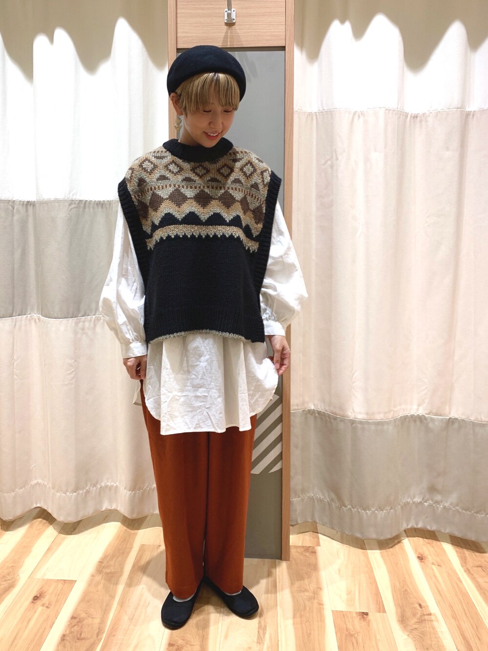柄のニットベストとチュニックの レイヤードスタイル◎ モノトーンのベースに パッと映えるカラーパンツが ポイントです🍊