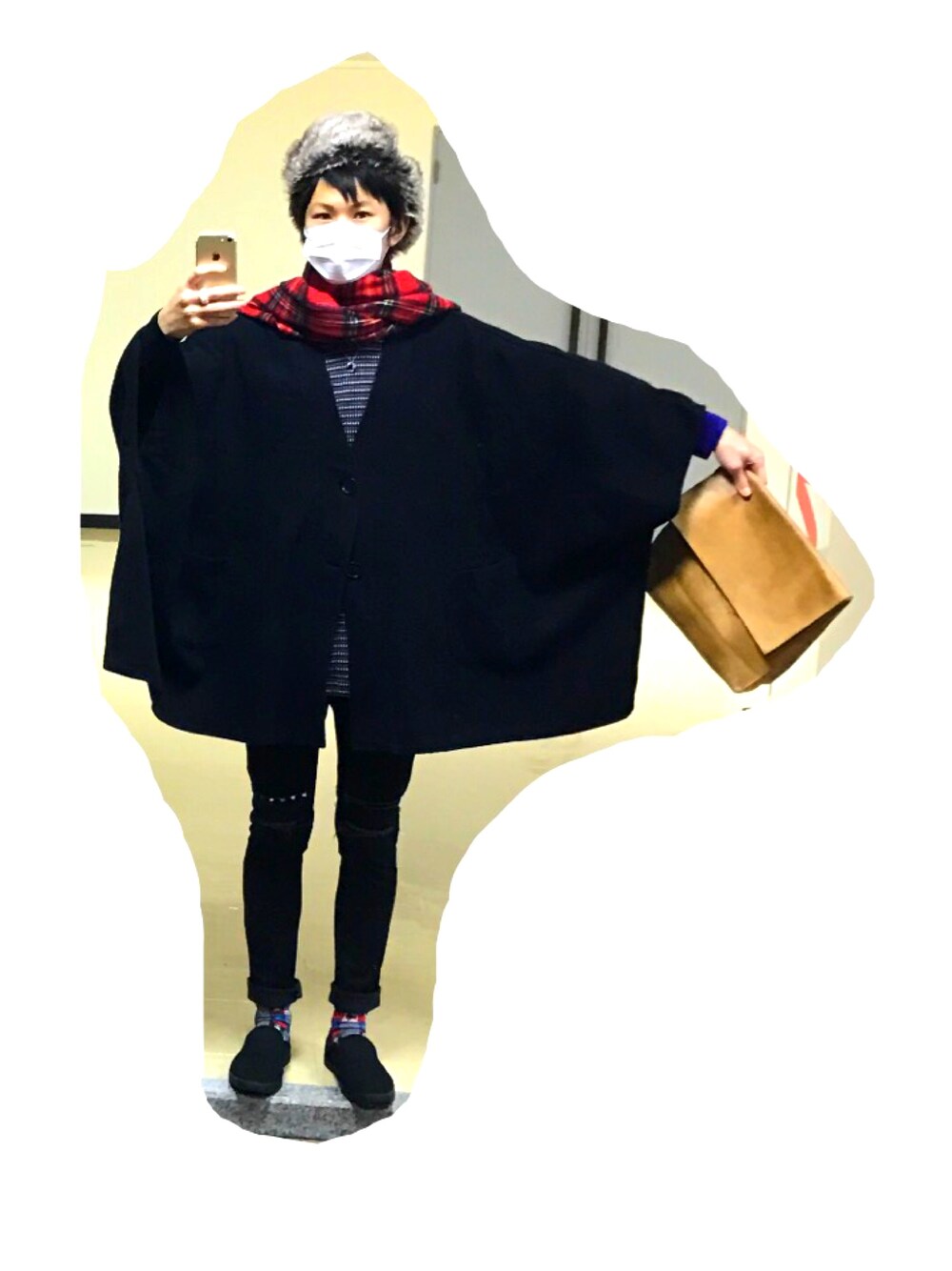 ぺろり菌のポンチョ「BOX ケープ」を使ったコーディネート