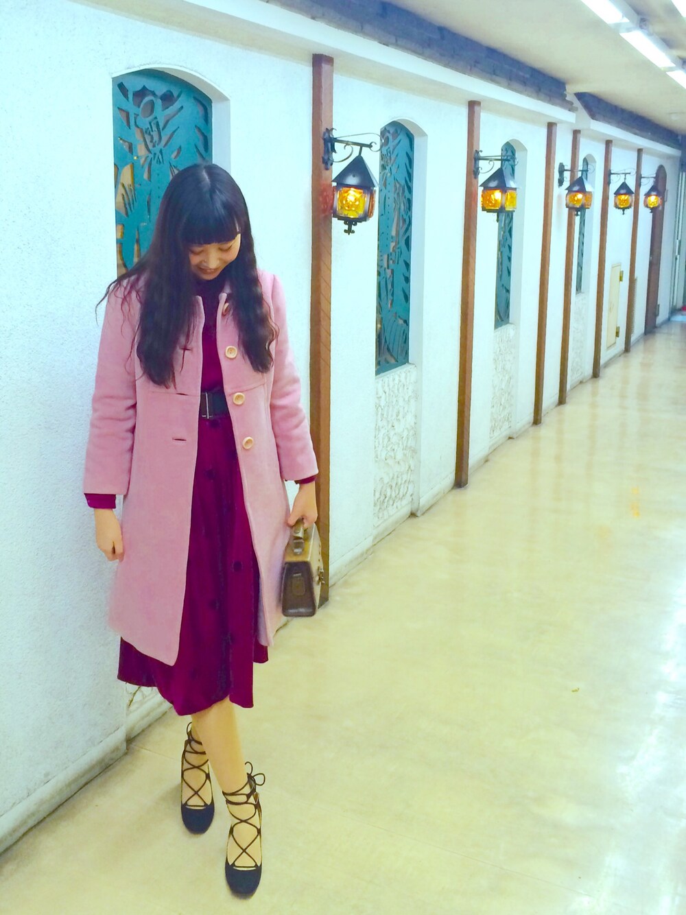 全身お気に入りの物ばかり. 下北沢で買ったピンクのコート. 一目惚れのドット柄ワンピース. 念願のzaraのヒール.