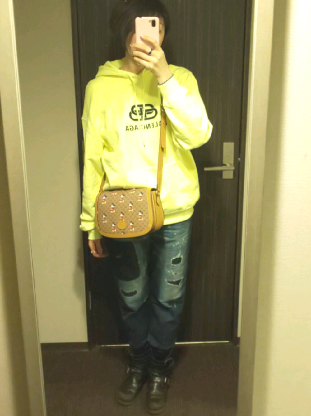 この前のコーデ❗️ 初、ネオンカラーに挑戦😆 ネオンカラーを着ているだけで ちょっとは気分も上がった気がする😁