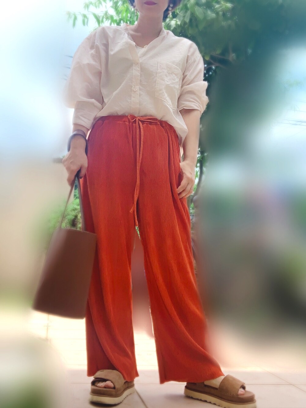 オレンジコーデ。 プリーツパンツ楽すぎて好き。