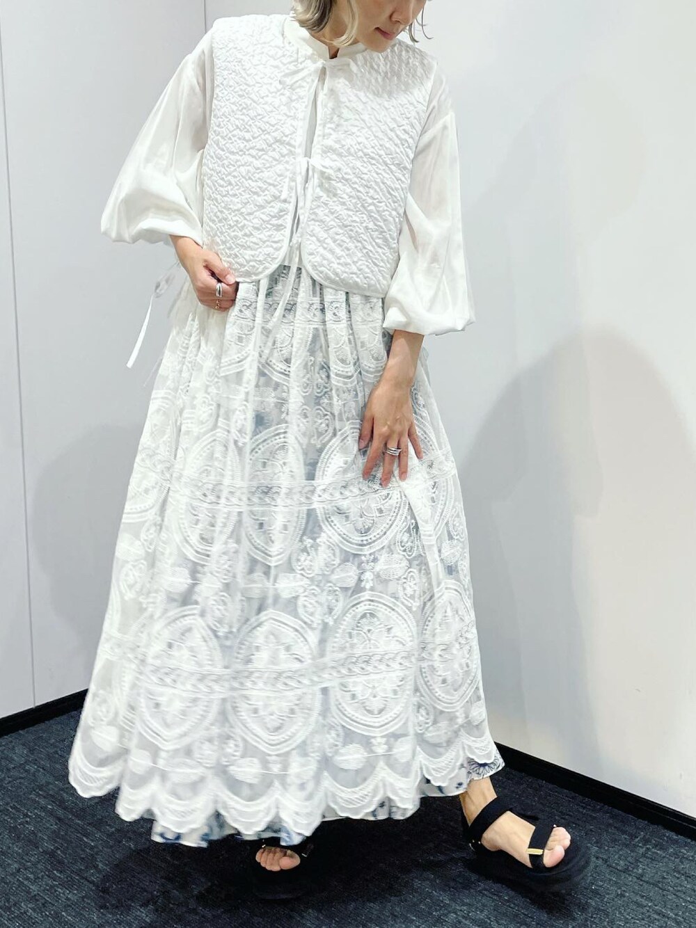 ひろまち(CAROLINA GLASER)のシャツ/ブラウス「Aya × CAROLINA GLASER / レース ロングブラウス」を使ったコーディネート
