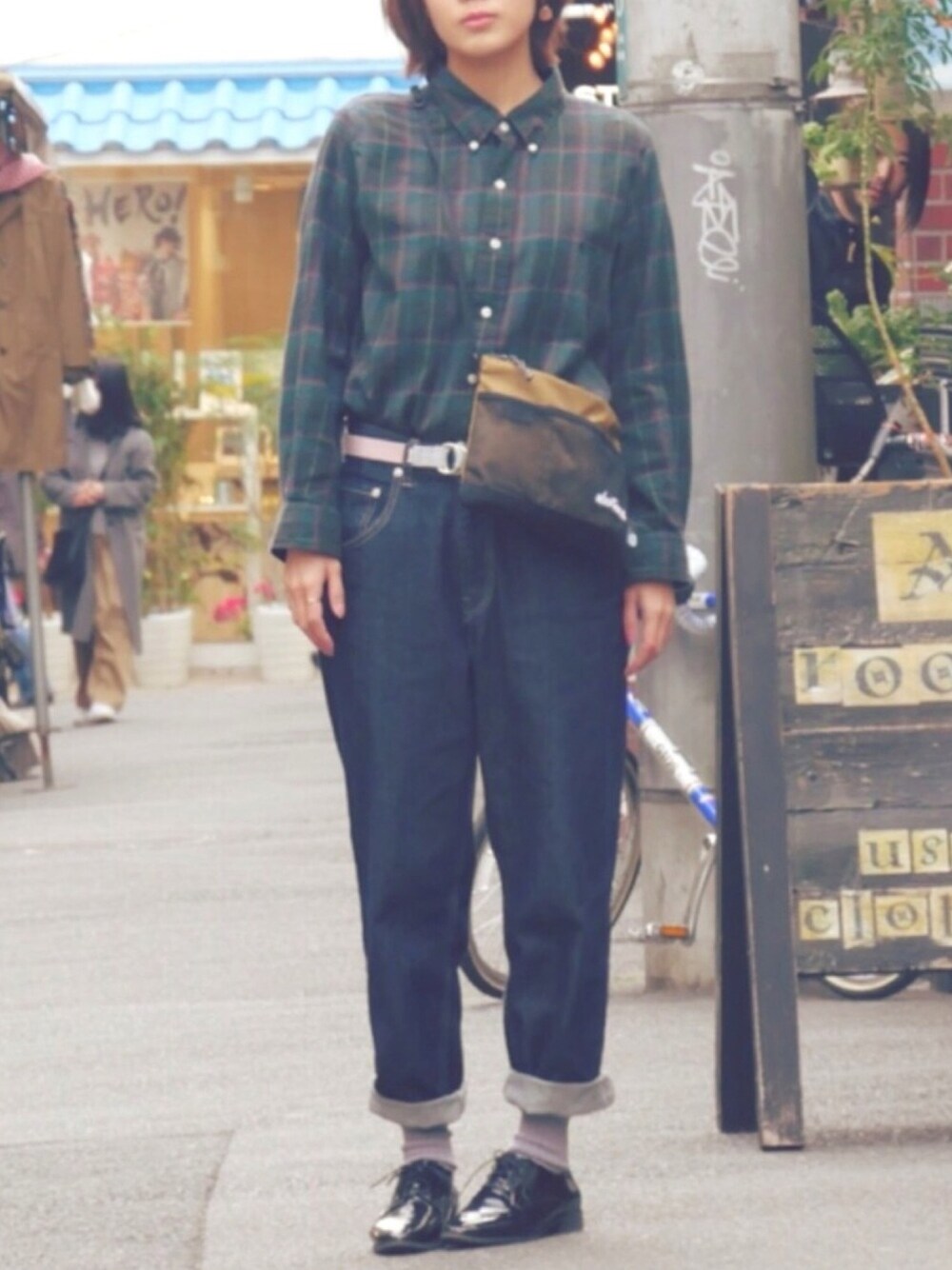 このデニムラインが綺麗!チェックシャツはワンピなんだけど、この日はしっかりしまってみた😏