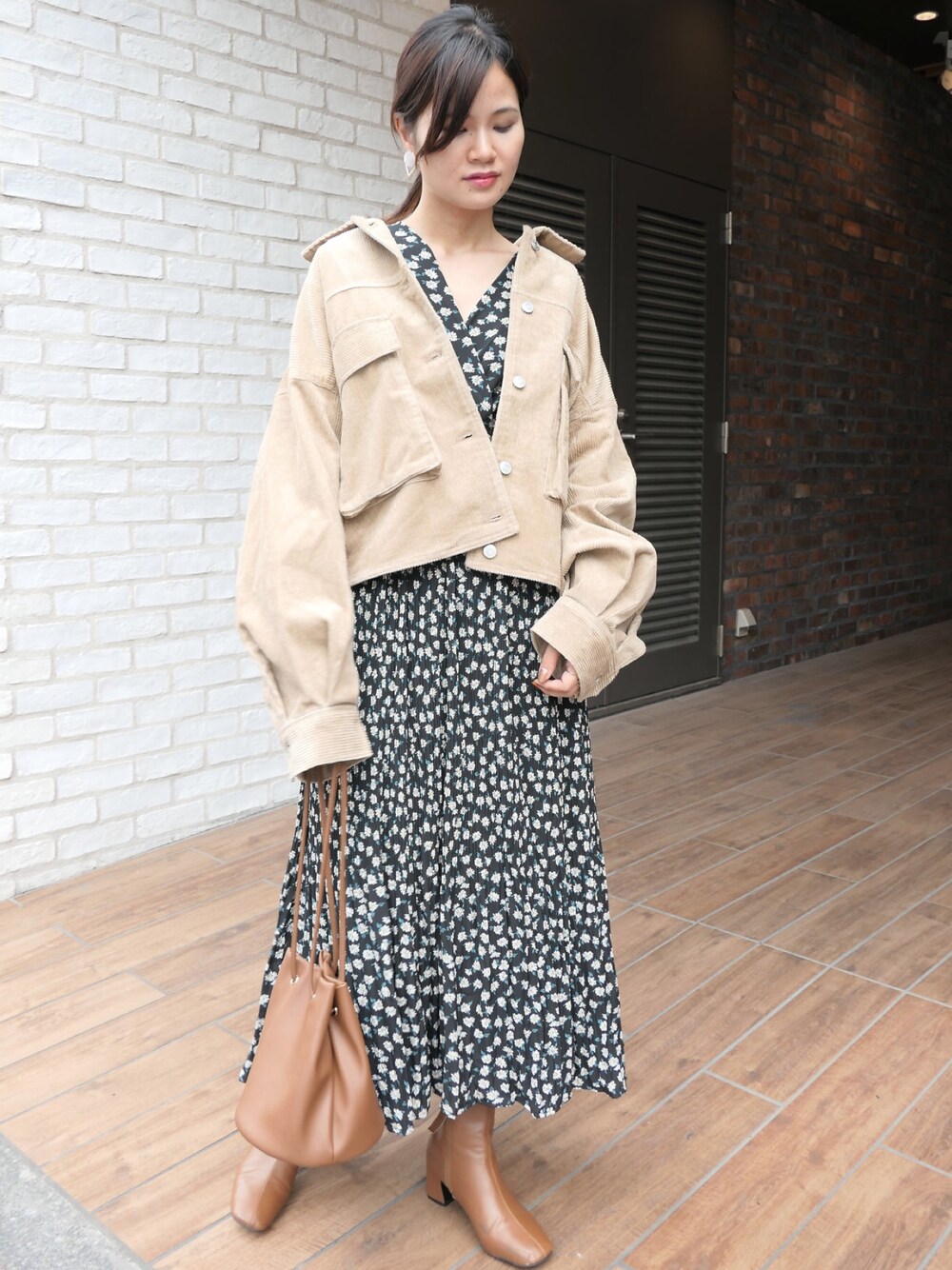 人気の花柄ワンピの 新色着用してます✨ コーデュロイジャケットも 合わせやすく、 何度もコーデに使用😆 ただ今 コーナーズにて 1000円オフクーポン中🤩 どちらも対象アイテムです! これは買いですね💡😌
