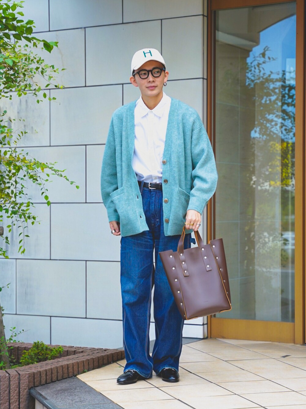 ご覧いただきありがとうございます! GUのカーディガンを使った寒色コーデ あえてブラウンのバッグを取り入れて上品なコーデに!