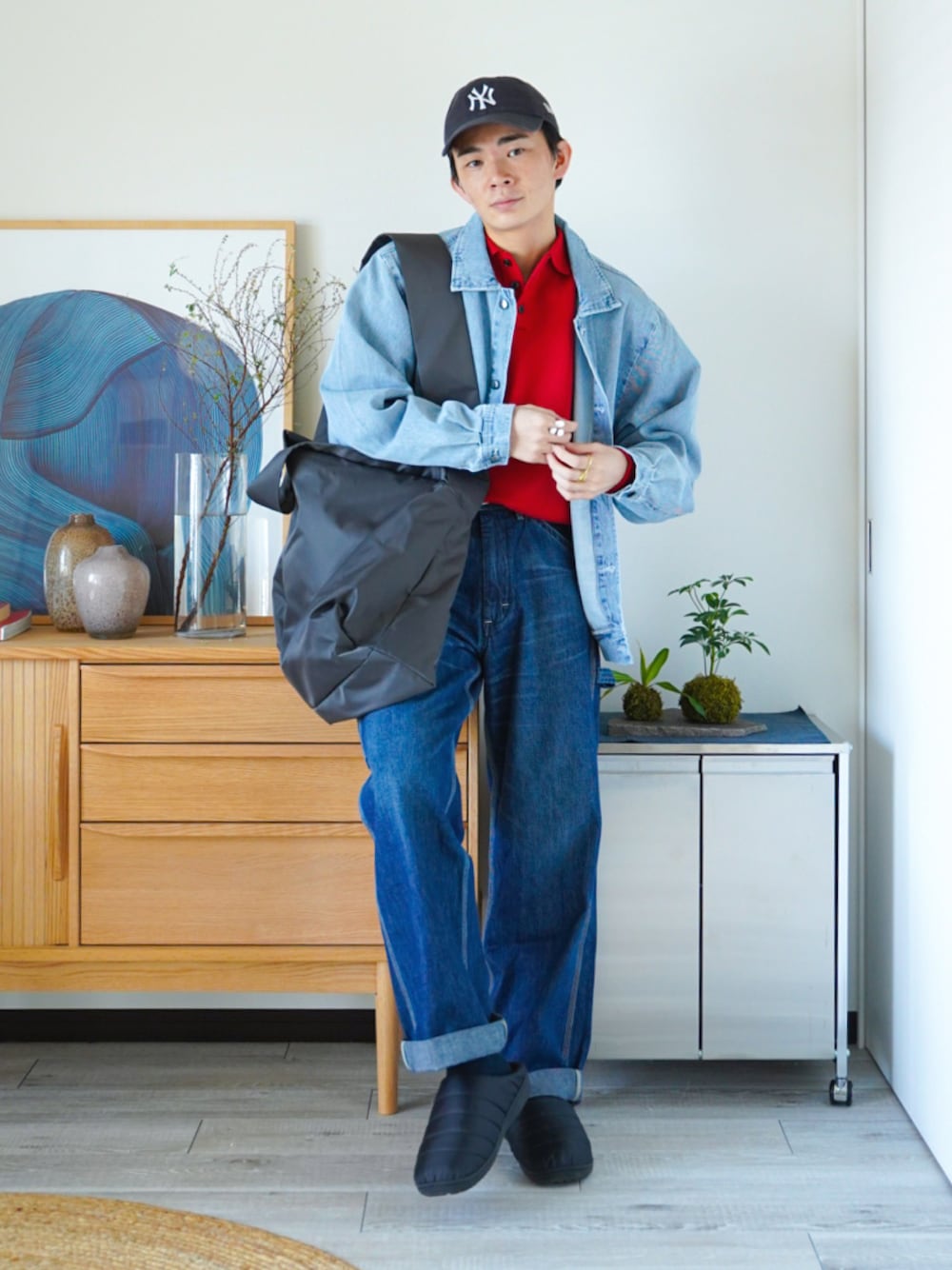 idakaのデニムジャケット「【新色追加】 ビッグシルエット ヴィンテージライク ケミカルウォッシュ加工 グラデーション デニムブルゾン / Gジャン デニムジャケット / ダブルポケット デニムブルゾン」を使ったコーディネート