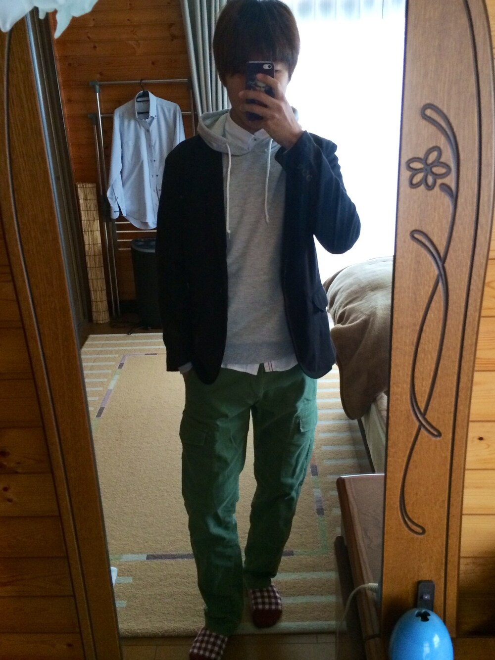 いたってシンプルなジャケットコーデ。 柄は足元で取り入れました。