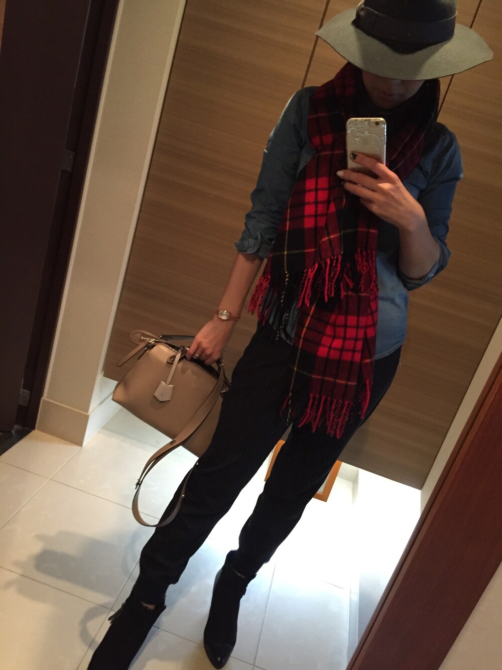 ダンガリーと赤チェックストールとハット! フェンディのバイザウェイがお気に入りです! 赤チェック大判ストールは、イデアルーチェで販売中です! http://idea-luce.net/
