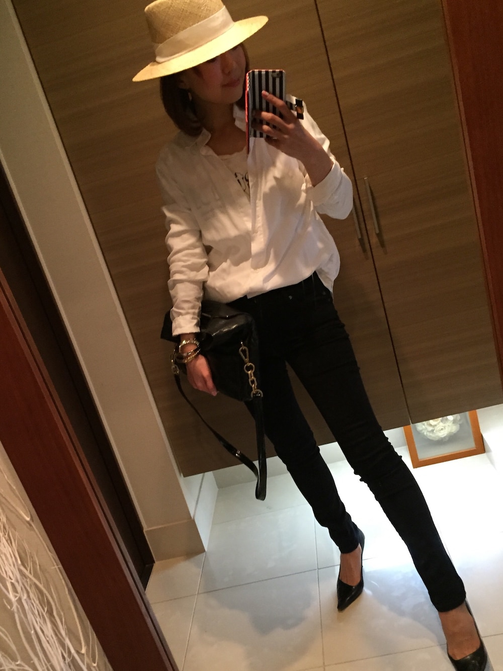 オーバーシャツを緩めに。前裾のみパンツにインしました! 白黒コーディネート。 ハットで柔らかく。