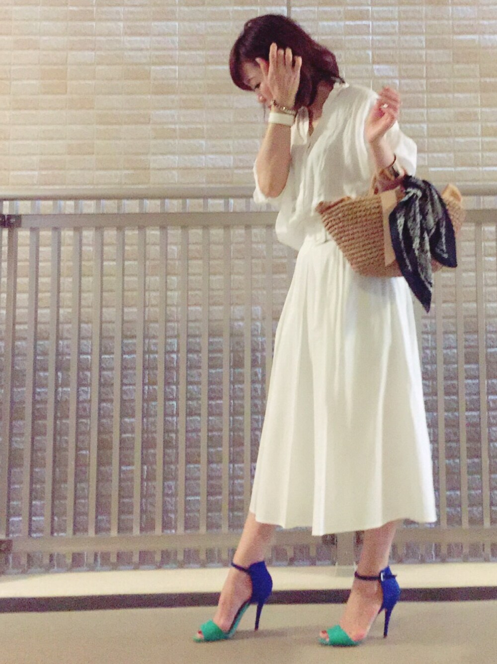 ホワイトコーデ♡ ビッグラインのリネンシャツ×コットンスカート! 靴でポイント!