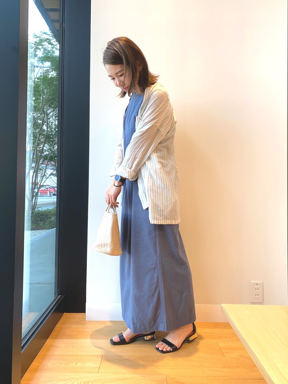 一目惚れしたアーバンリサーチの麻混ストレートロングワンピースです。 まだ少し肌寒いときもあるので、今回はスクエアカットシャツを合わせました! 夏になったらワンピース1枚で。 背中のボタンが可愛いです◎