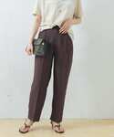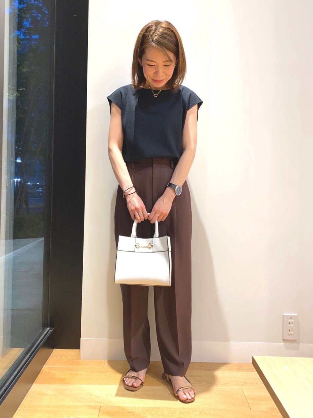 ブラックのトップスにブラウンのパンツで落ち着いた色味で合わせてみました。 どちらも着回し抜群のアイテムです◎