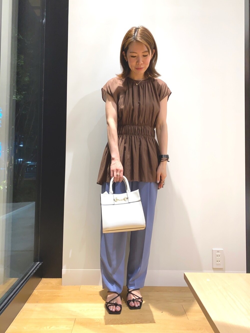 ROSSOのトップス+ボトムできれいめコーデ! ブラウスの腰のシャーリングのおかげで脚長効果◎ サンダルも華奢なデザインで可愛いです◎