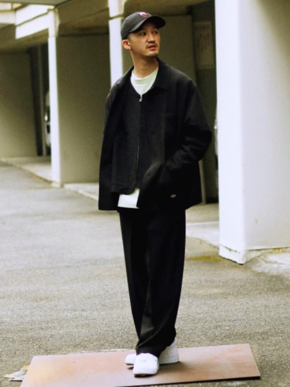 身長170cm 全てLサイズ着用 全体をモノトーンでまとめ、インナーで差し色を加えたカジュアルコーデです。 ブルゾンのセットアップのインナーとして、ベストを取り入れることでこなれ感がアップします。 ベスト自体にデザインが施されてるので、ブルゾンを脱いだコーディネートなど、使い勝手の良いデザインです。 全て普段よりもワンサイズ大きいものを着用しております。