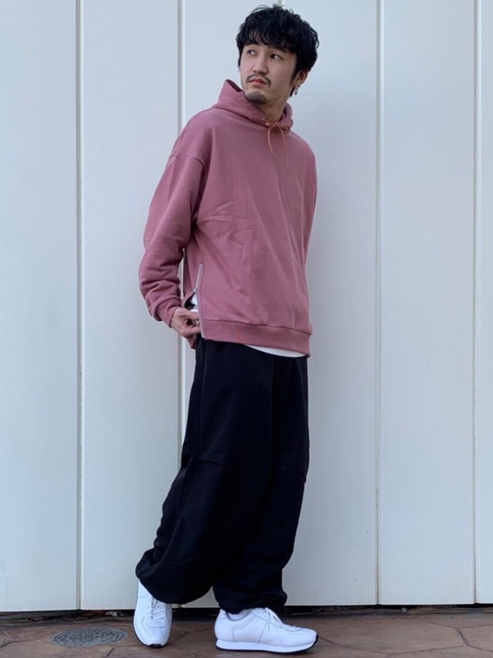 身長170cm 着用サイズ【全てLサイズ着用】 ピンクのパーカをメインにコーデを組んでみました。 ピンクを引き立てるために、パンツはブラックに。 パーカのサイドにはジップ付きで、スリットが入っているので、インナーをチラ見せする事でコーデがワンランクアップします。女性が着用しても可愛いアイテムです! パンツは裾にドローコード付きで、シルエットも太めでトレンドなアイテムです。 ※こちらのスタイリングはWeb限定の商品も含まれたものになります。店舗での販売がない商品につきましてはご了承ください。