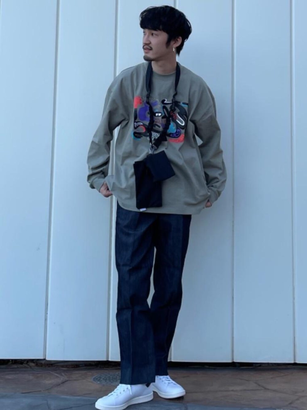 身長170cm 着用サイズ【トップス:L、パンツ:S】 シンプルに、ロンT×デニムライクのパンツでコーデを組んでみました。 胸元のイラストが着るだけで目を惹くアイテムです。 コーデがシンプルになりがちな時は、バッグなどの小物でワンポイントプラスしてあげるとコーデがワンランクアップします。 ※こちらのスタイリングはWeb限定の商品も含まれたものになります。店舗での販売がない商品につきましてはご了承ください。