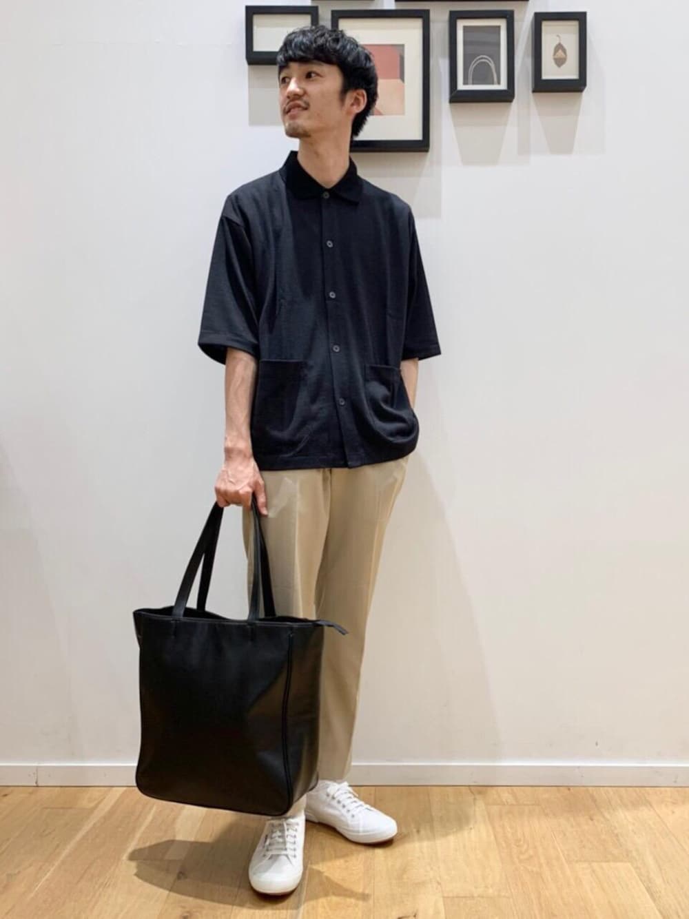 身長:170cm 普段サイズ:シャツ M / ボトムス S / シューズ 26.0cm 【サイズ感】 シャツ:ややゆったり ボトムス:標準的 シューズ:やや細め 【コーディネートポイント】 ビジネスカジュアルスタイル。アイテムの素材、デザインの選択で、程よいリラックス感を演出しております。ビジネスですので、カラーは落ち着いた印象のブラック×ベージュを選択しております。上下ともに楽に着ていただけるアイテムなので、長時間デスクワークをする方にもおすすめです。