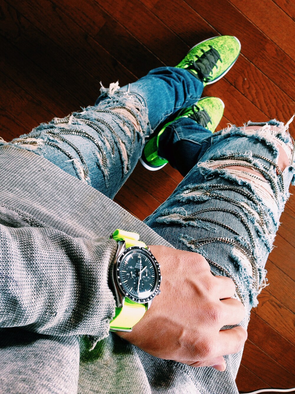 唯一無二のコーデをしたい… サンローランのチェーンデニムにヴィンテージのスウェットを。スウェットは50'sかな? ダメージ×ダメージでちょっと汚くなっちゃうから、ネオンで締めました。