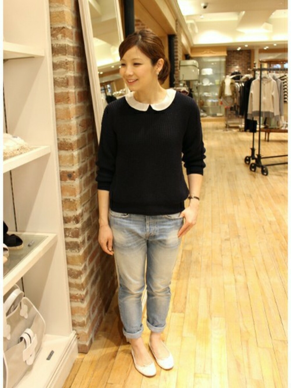 お気に入りのMAURO GRIFONIのデニムにシンプルなミドルゲージニットを組み合わせて メンズライクなスタイリングにならないように、白のバレーシューズや丸襟で女性らしさをプラスしました