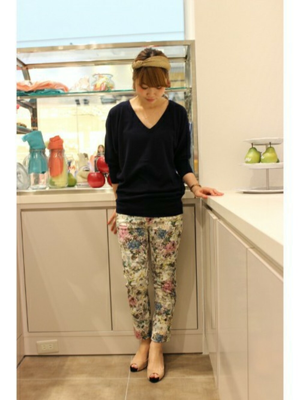 プリントパンツにはシンプルなVネックニットを合わせるだけでも映えます!