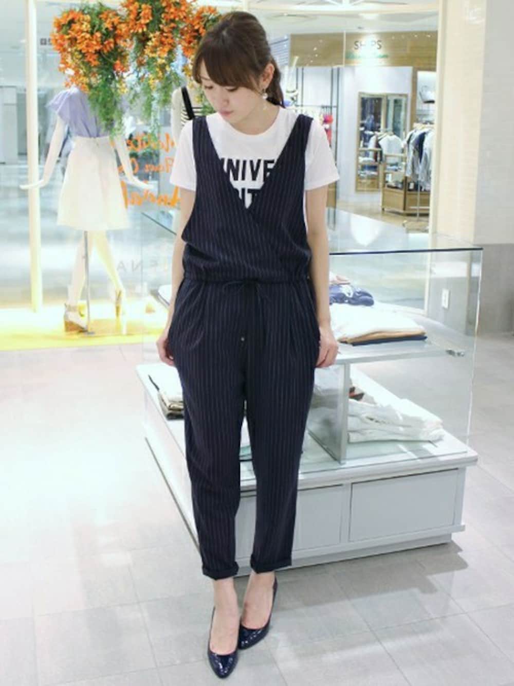 サロペットは、他にはないストライプ柄で差をつけて♪ INにTシャツでカジュアル見えですが、足元のパンプスが引き締めてくれます