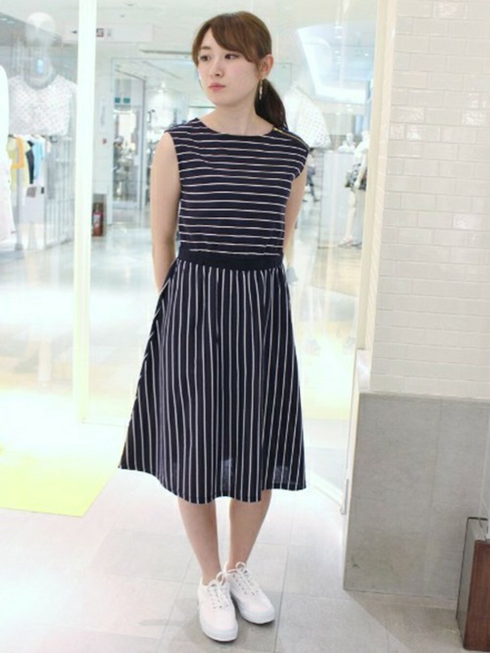 ストライプとボーダーを組み合わせた、トレンド感のあるワンピース カットソー素材で着心地も抜群♪ 長めの着丈とスニーカー合わせが今年らしいコーディネートです!