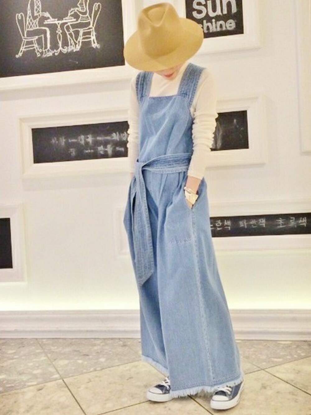 KAREN WALKERのオススメのデニムオールインワン! ワイドなパンツラインにスニーカーでスタイリング。 今年トレンドの70年代らしく、裾は切りっぱなしです。 ウェストベルトはラフに結んで。