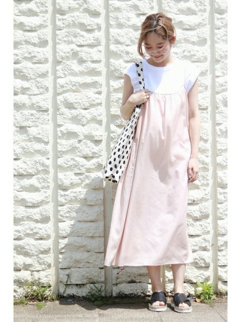 かわいらしいシルエットを引き立たせるピンク。ブラックの小物で引き締めて。