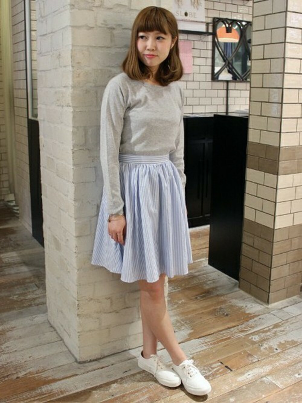 スカートが主役のコーデ☆ トップスはINして、足元もさわやかに♪ 靴下×スニーカーが今年らしいですね