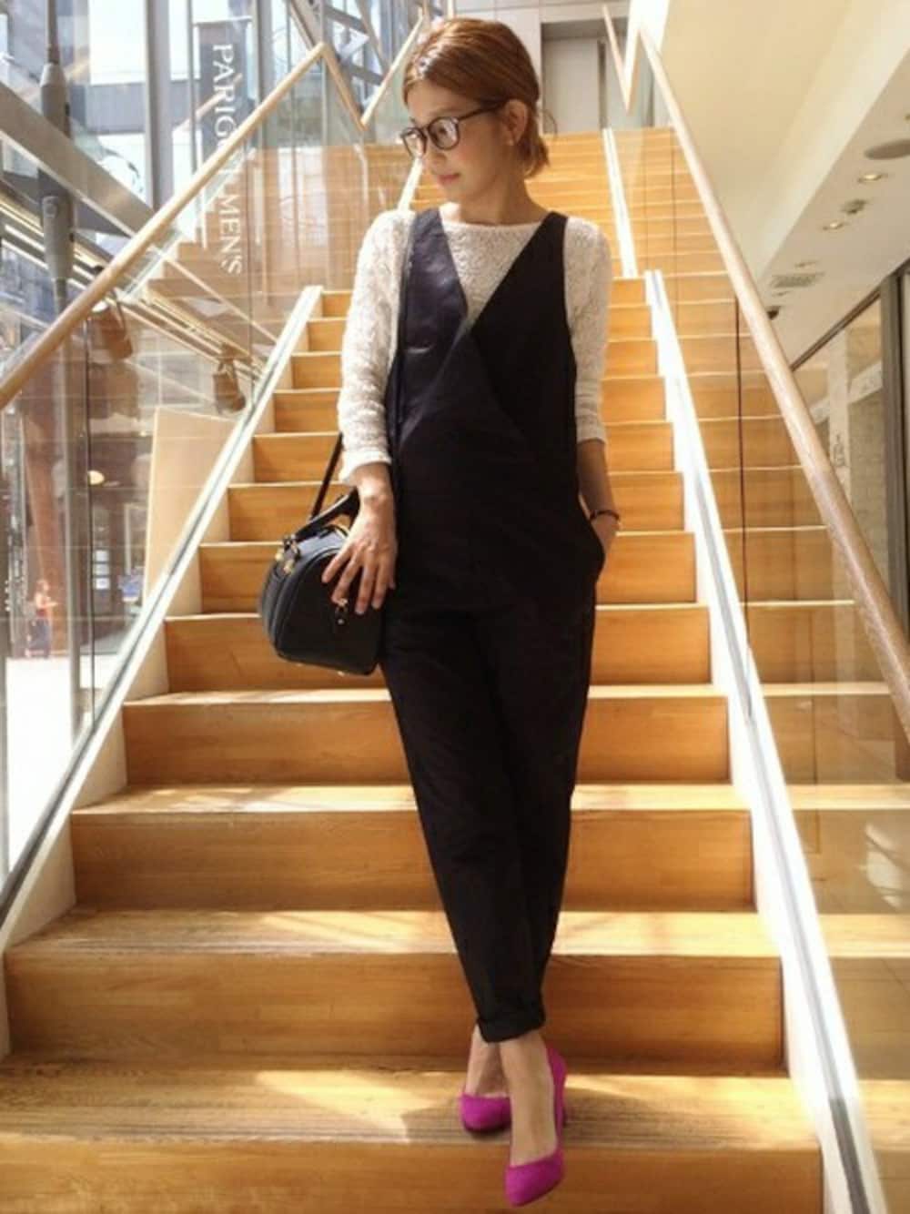 モノトーンコーディネートが、レースのトップスとピンクのパンプスで大人可愛い印象に♪