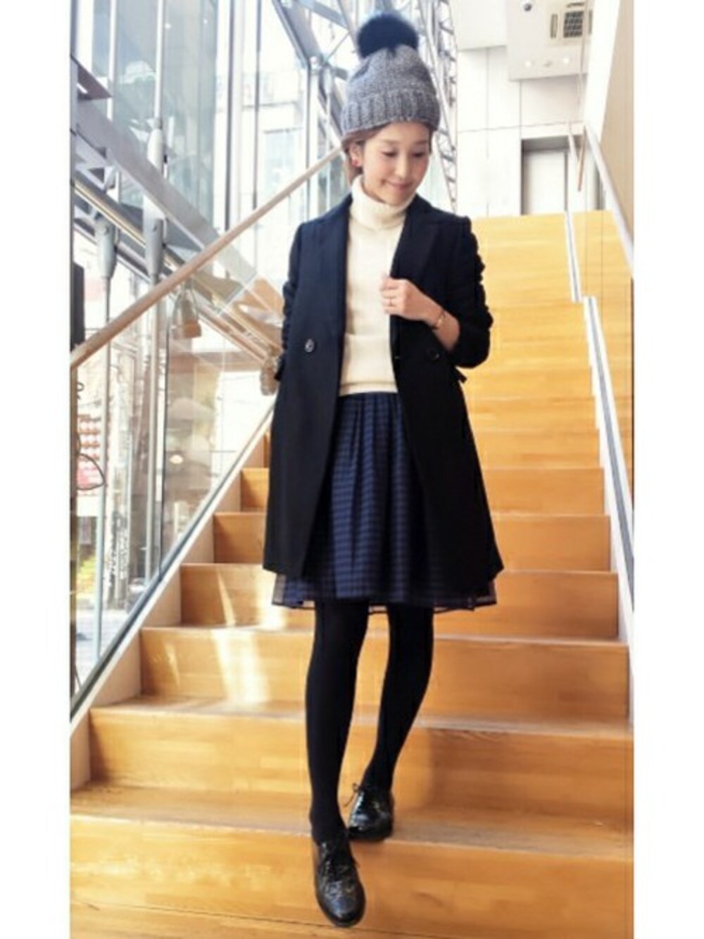 ローゲージニットにオーガンジースカートのフェミニンなスタイリングをピリッと締めてくれるチェスターコート☆ そしてポイントは決まりすぎない抜け感を出す、ファー付きのニット帽。 かっこいいイメージのチェスターコートをガーリーに着たい気分です!