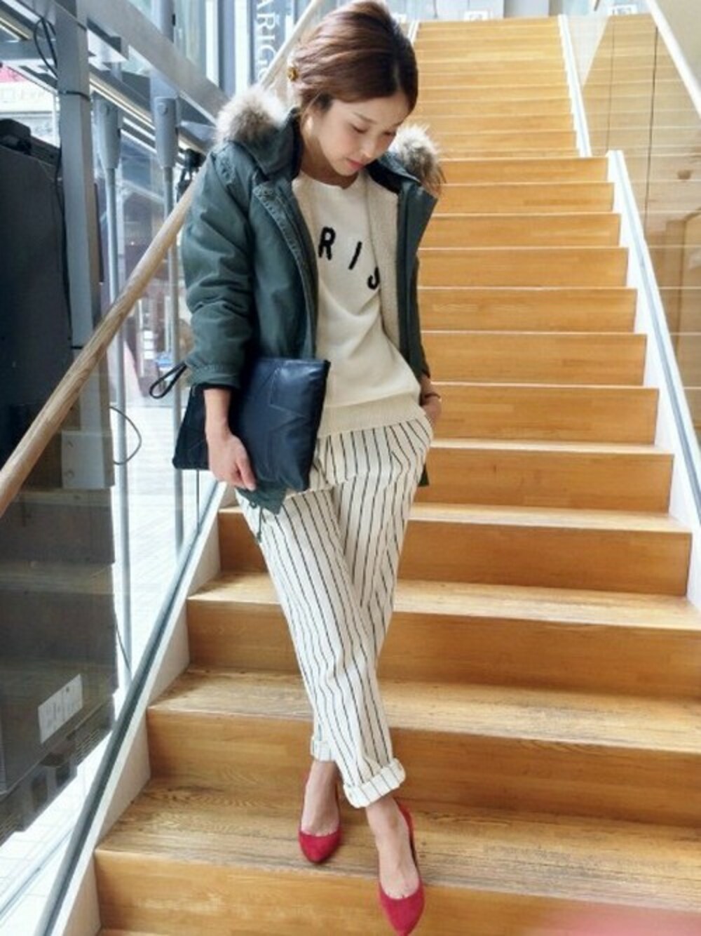 毎シーズン安定の人気を誇るモッズコート。 今季大注目のレジメンタックパンツに足元をパンプスで合わせた大人フレンチなコーディネートです。 インのコーディネートはホワイト今年らしくまとめて♪