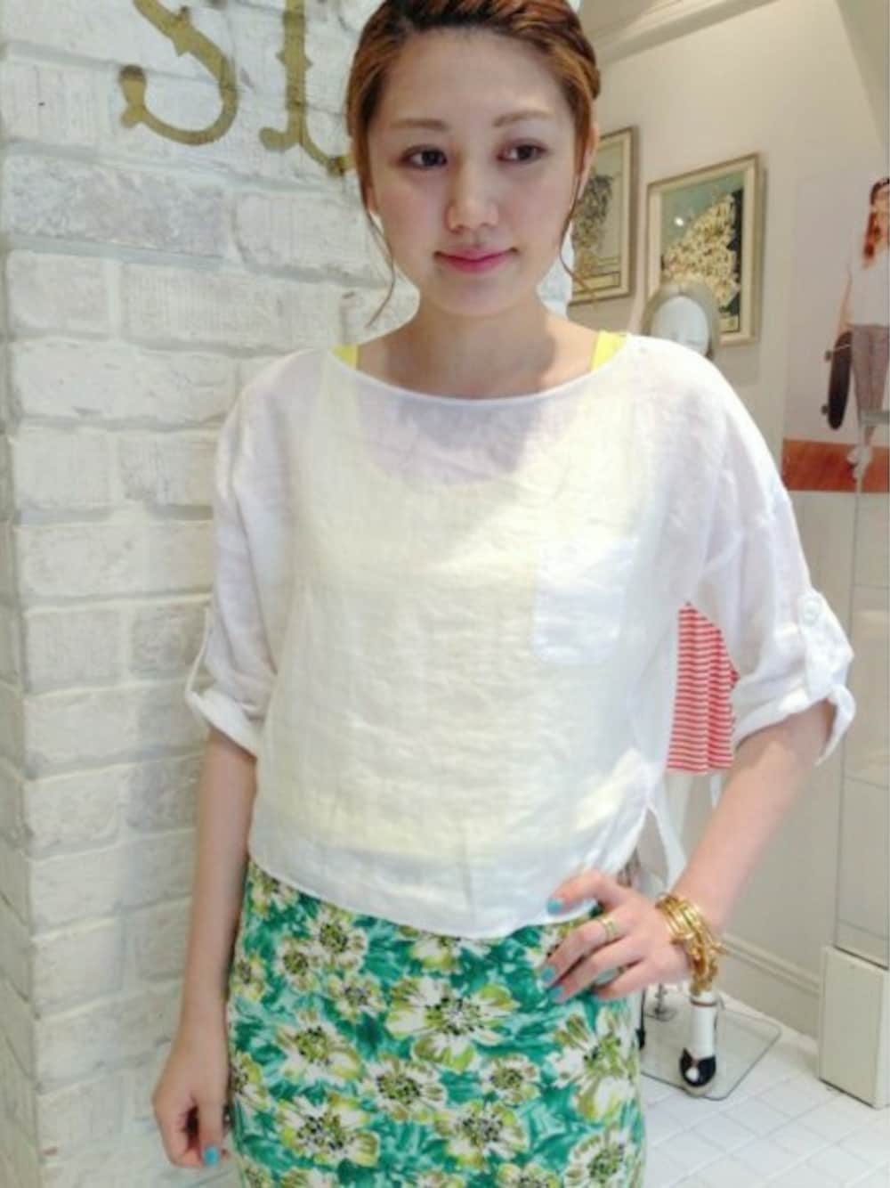 清涼感たっぷりのリネンのブラウス 黄色やイエローの鮮やかな柄ボトムで夏らしく着こなしました